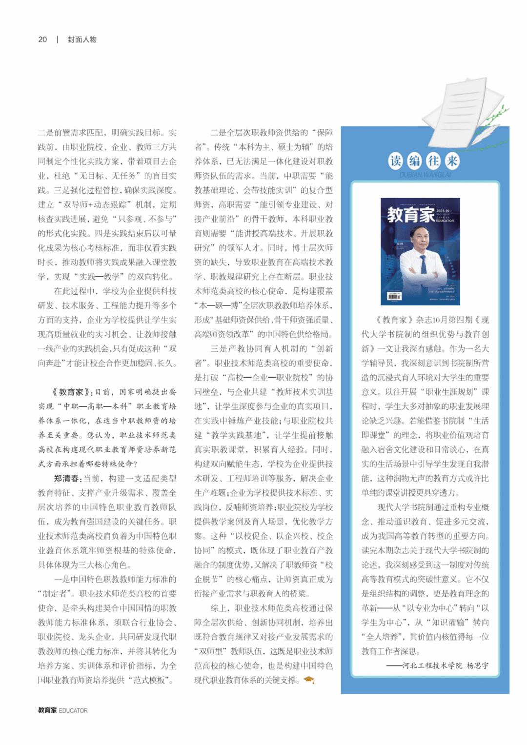 郑清春:职业技术师范教育作为一种特殊类型的师范教育,实质上是集高等教育、师范教育、职业教育于一体的新型高等师范教育。过去,对职业教育师资培养的瞄准维度是“够用”,重点关注学生的学科专业性、师范性、职业性,对学术性的重视不足,导致部分师资虽能满足基础教学需求,却难以应对产业技术迭代与教育教学改革带来的深层挑战。随着职业教育向本科层次延伸以及与产业链的深度绑定,学术性价值愈发凸显。学术训练能帮助学生搭建“理论—方法一实践”的完整知识框架,不仅掌握专业领域的核心技术原理,更能理解知识的内在逻辑与产业应用边界,形成独立解决复杂技术问题的探究能力;扎实的学术功底是师资创新能力的源头,无论是将企业技术难题转化为教学项目,还是基于教学实践开展职业教育研究,都须依托学术思维与研究方法,确保师资在未来职业生涯中具备持续成长的后劲;面对职业教育不断优化升级,学生学习自主性增强、发展路径多元化的新趋势,学术性培养能够帮助教师更好地指导学生开展项目研究、应对产业变革,为其长远发展赋能。