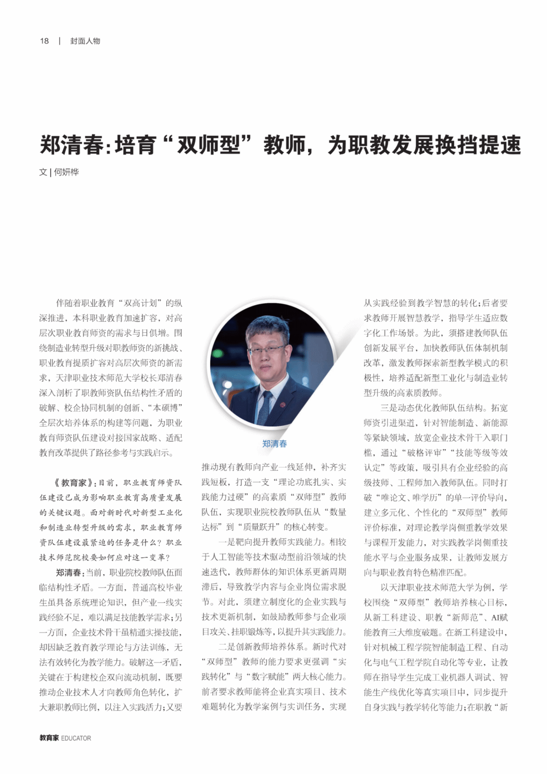 郑清春:当前,构建一支适配类型教育特征、支撑产业升级需求、覆盖全层次培养的中国特色职业教育教师队伍,成为教育强国建设的关键任务。职业技术师范类高校肩负着为中国特色职业教育体系筑牢师资根基的特殊使命,具体体现为三大核心角色。