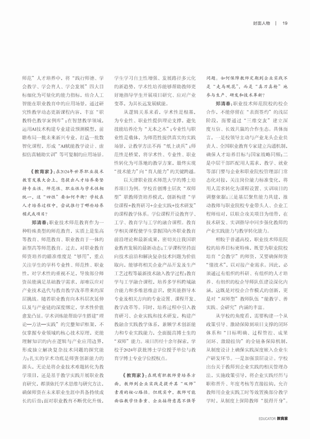 《教育家》:在2024年世界职业技术教育发展大会上,您提出人才培养要坚持专业性、师范性、职业性与学术性相统一,这“四性”要如何平衡?学校在人才培养过程中,尝试推行了哪些培养模式或项目?