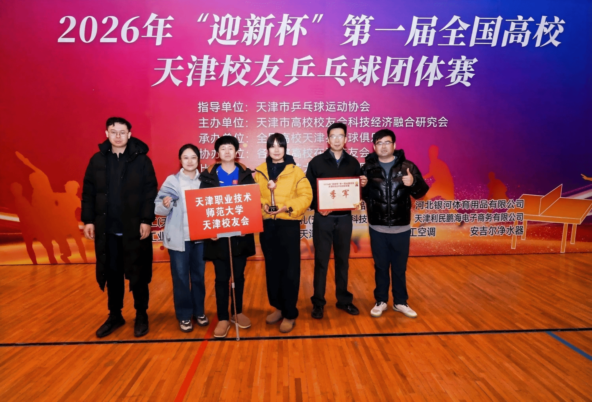 1月3日,2026年“迎新杯”第一届全国高校天津校友乒乓球团体赛在天津科技大学(河西校区)体育馆圆满落幕。经过激烈角逐,我校天津校友会代表队凭借出色表现斩获季军,展现了天职师大人团结拼搏的精神风貌。